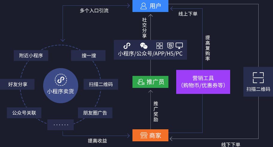 支持公众号、小程序、H5、APP、PC端等多社交途径