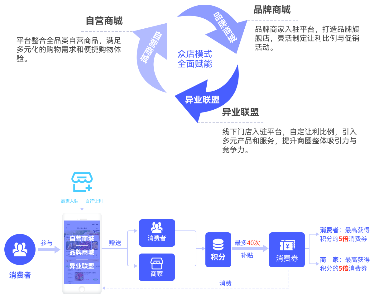 举例:商家A自行设置让利比例为20%,商家及其店内的消费者均可获得让利额等量的积分,同时还可获得积分数量5倍的消费券
